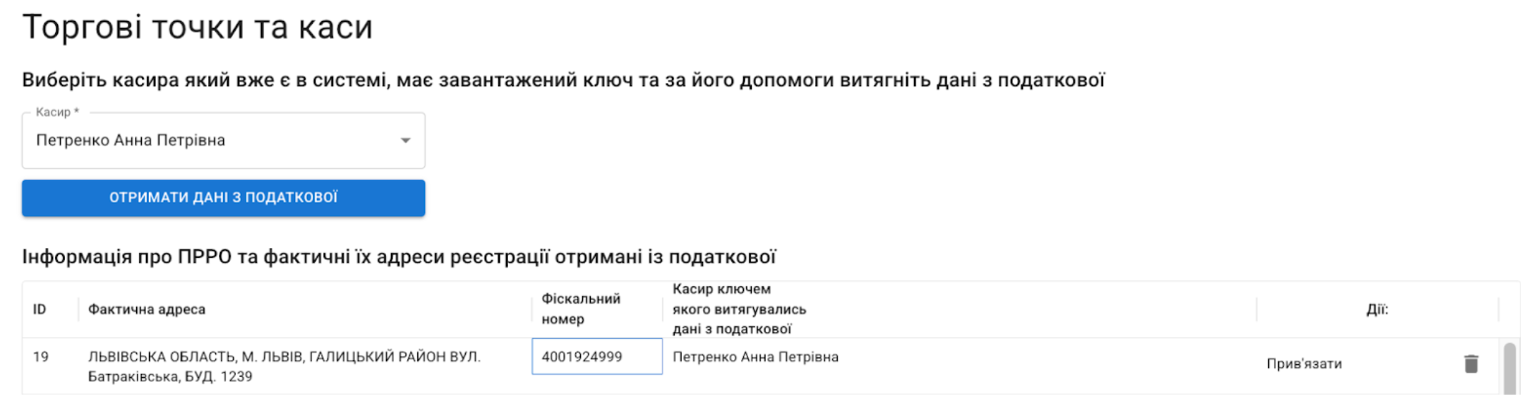 І після натиснення кнопки “Отримати дані з податкової” маємо отримати в таблиці знизу записи про нові фіскальні номери, адреси.